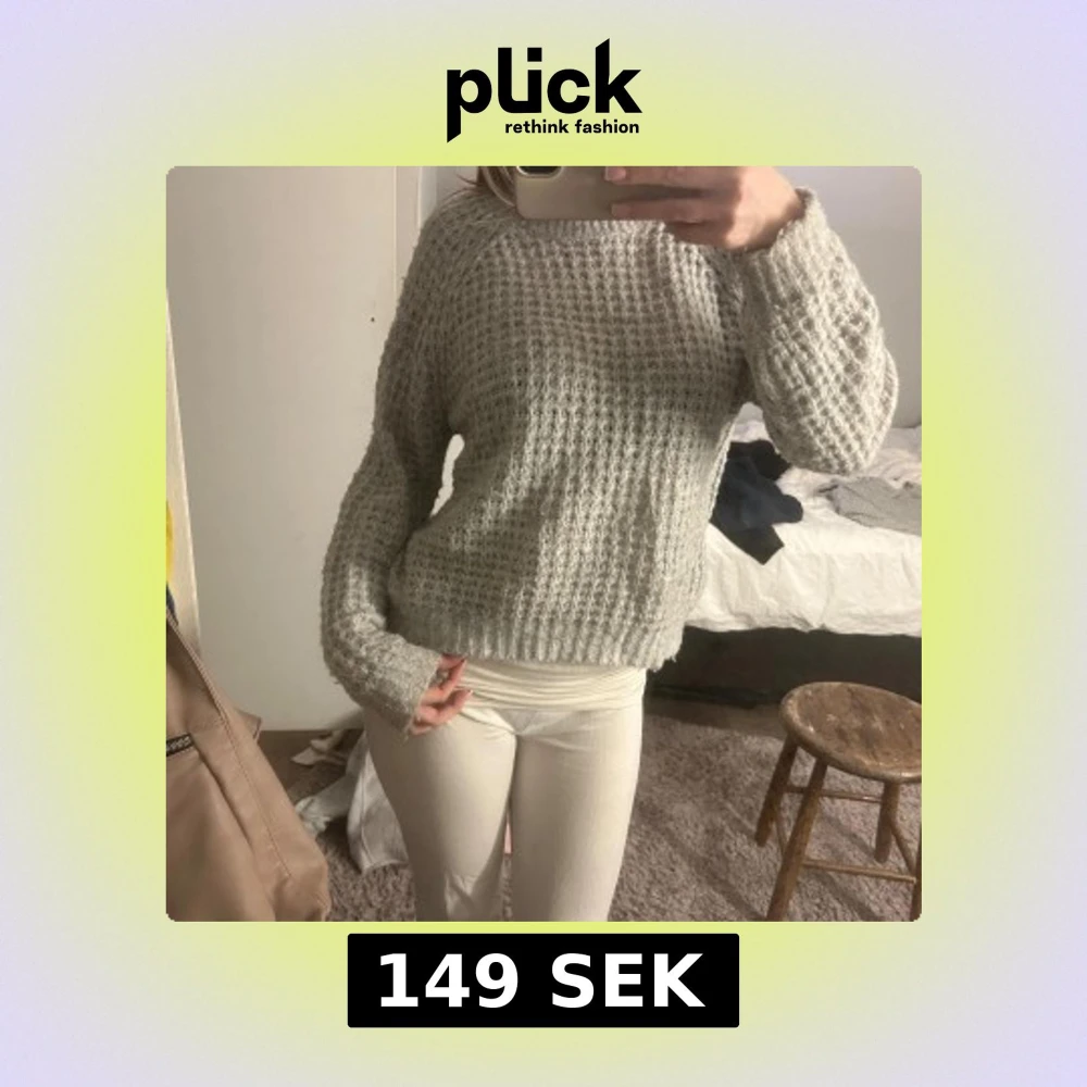 Säljer en ljusgrå stickad tröja med grov, strukturerad yta och ribbade muddar vid ärmslut och nederkant. Tröjan har en rund hals och långärmade, lite loose passform som ger en chill vibe. Perfekt för att hålla sig varm och snygg under kyliga dagar.