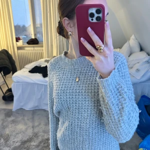 Mysig ljusblå stickad tröja med rund halsringning och långa ärmar. Perfekt för kyligare dagar och ger en avslappnad stil. Passar bra till jeans eller kjol för en casual look.