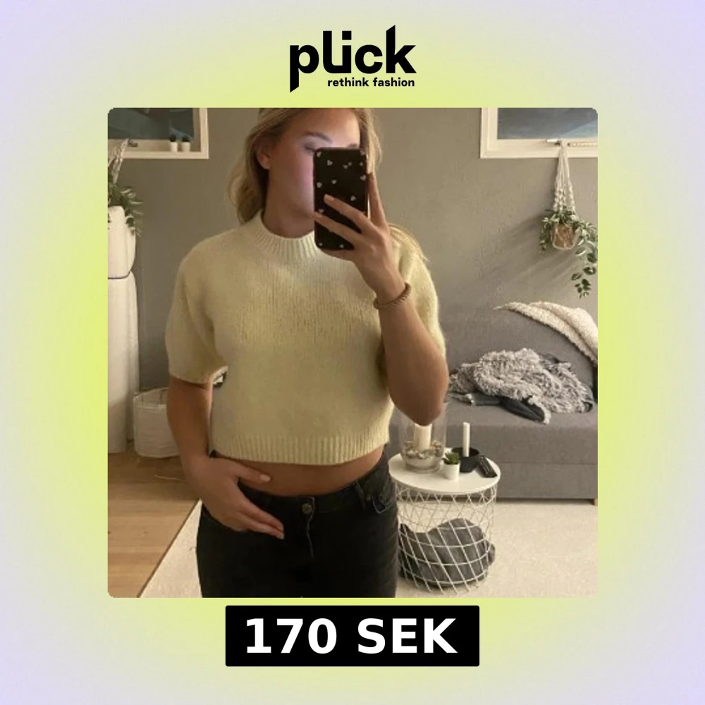 Superfin ljusgul croppad stickad topp med korta ärmar och ribbad kant vid hals och nederdel. Mjuk och fluffig känsla, perfekt att styla med höga jeans eller kjol. Enkel design som ändå känns trendig och fräsch.