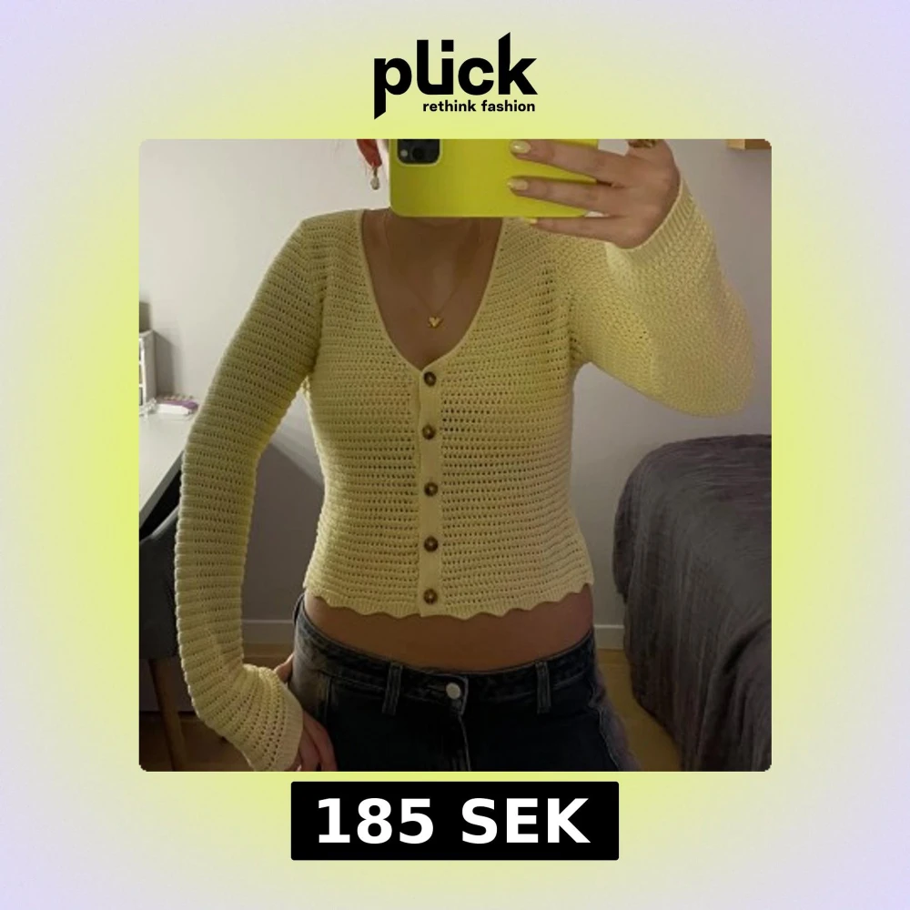 Superfin ljusgul stickad kofta från Lindex med v-ringning och snygga bruna knappar framtill. Croppad modell med vågig kant nedtill och långa ärmar. Perfekt passform och passar till allt!