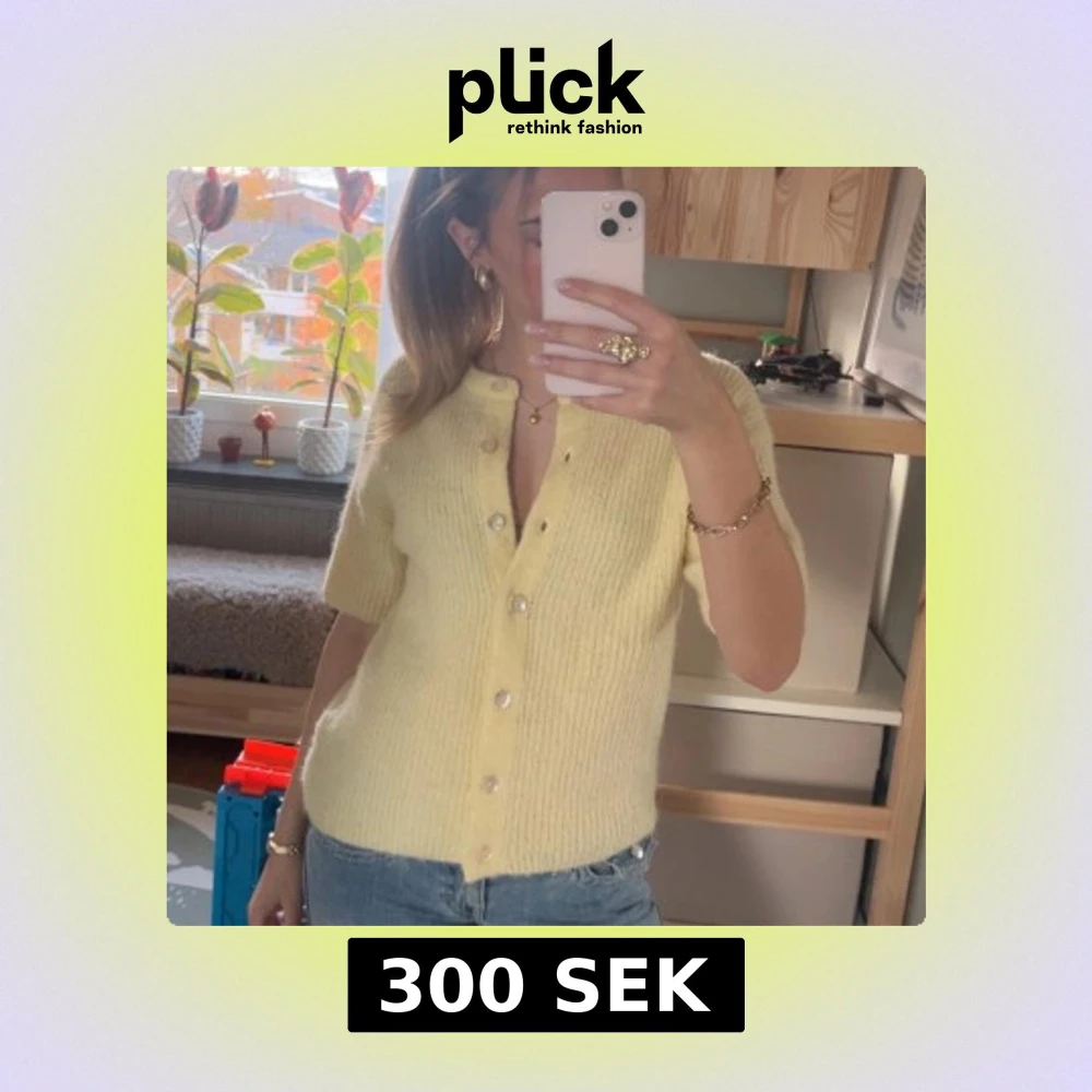 Superfin ljusgul stickad kofta med korta ärmar och pärlemorknappar framtill. Ribbad struktur och rund halsringning. Perfekt att styla med jeans eller kjol för en vardaglig look.