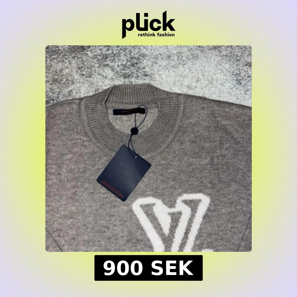 Snygg grå stickad tröja från Louis Vuitton med stort vitt LV-logo på bröstet. Rund hals och ribbade muddar vid ärmslut och nederkant. Perfekt för dig som gillar exklusiva märken och vill ha en stilren look.