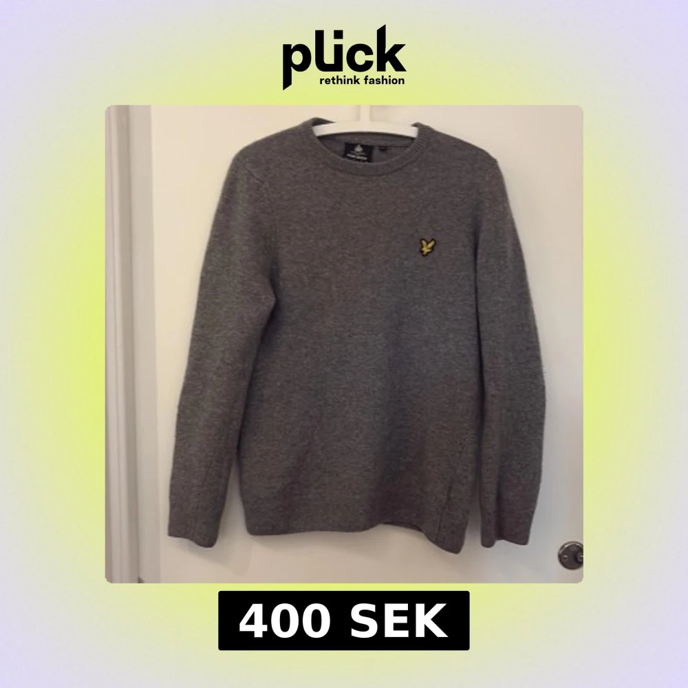 Säljer en grå stickad tröja från Lyle & Scott med rund hals och deras klassiska gula logomärke på bröstet. Tröjan har långärmade ribbade muddar och är tillverkad i mjuk ull, perfekt för kyliga dagar.