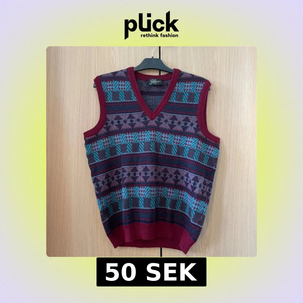 Säljer en färgglad stickad väst från Peluso med ett unikt geometriskt mönster i rött, blått och grönt. Västen har en v-ringad design och är perfekt för att lägga till lite retrostil till din garderob.