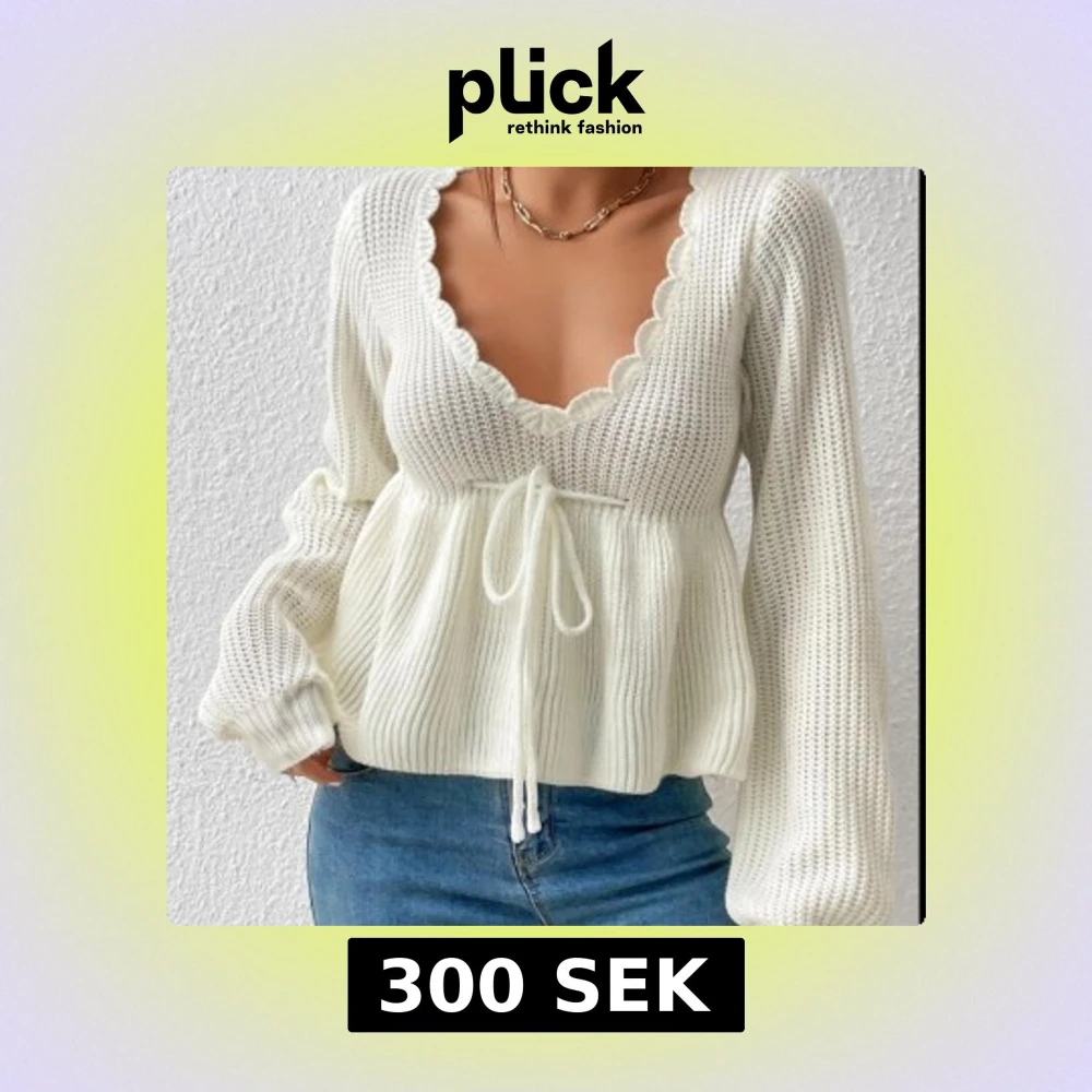 Superfin vit stickad tröja med djup v-ringning och volangkant längs halsen. Tröjan har långa ärmar, knytband i midjan och en lätt utsvängd passform nedtill. Perfekt för dig som gillar en söt och trendig look.