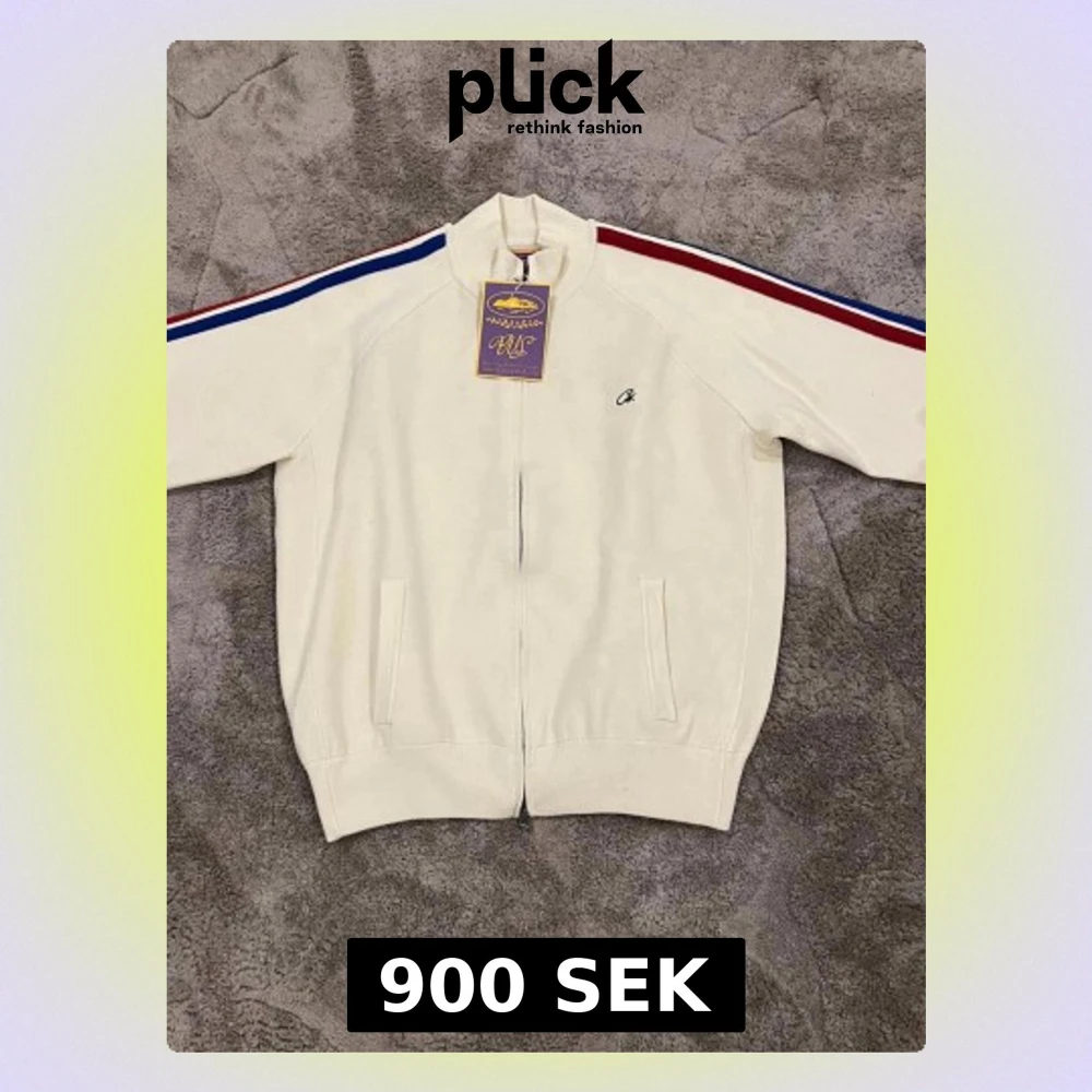 Säljer en clean vit kofta från Corteiz med dragkedja och coola blå och röda stripes längs ärmarna. Broderad Corteiz-logga fram och stor graffiti-text på ryggen. Ribbade muddar och hög krage för extra stilpoäng. Perfekt till streetwear-looken.