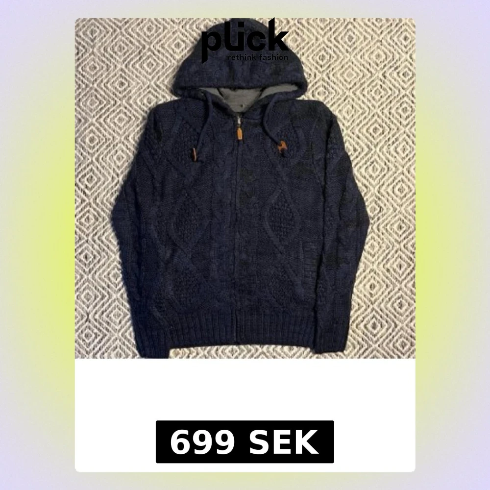 Säljer en mörkblå stickad hoodie med snyggt kabelmönster och huva. Tröjan har dragkedja framtill, snörning vid huvan och ribbade muddar vid ärmslut och nederkant. Perfekt för kyliga dagar och riktigt mysig att ha på sig.