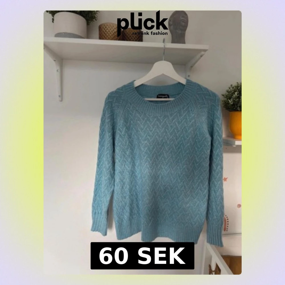 Säljer en ljusblå stickad tröja i storlek M. Tröjan har ett snyggt zigzag-mönster, rund hals och ribbade muddar vid ärmslut och nederkant. Perfekt för dig som gillar mjuka och bekväma plagg med lite extra struktur.