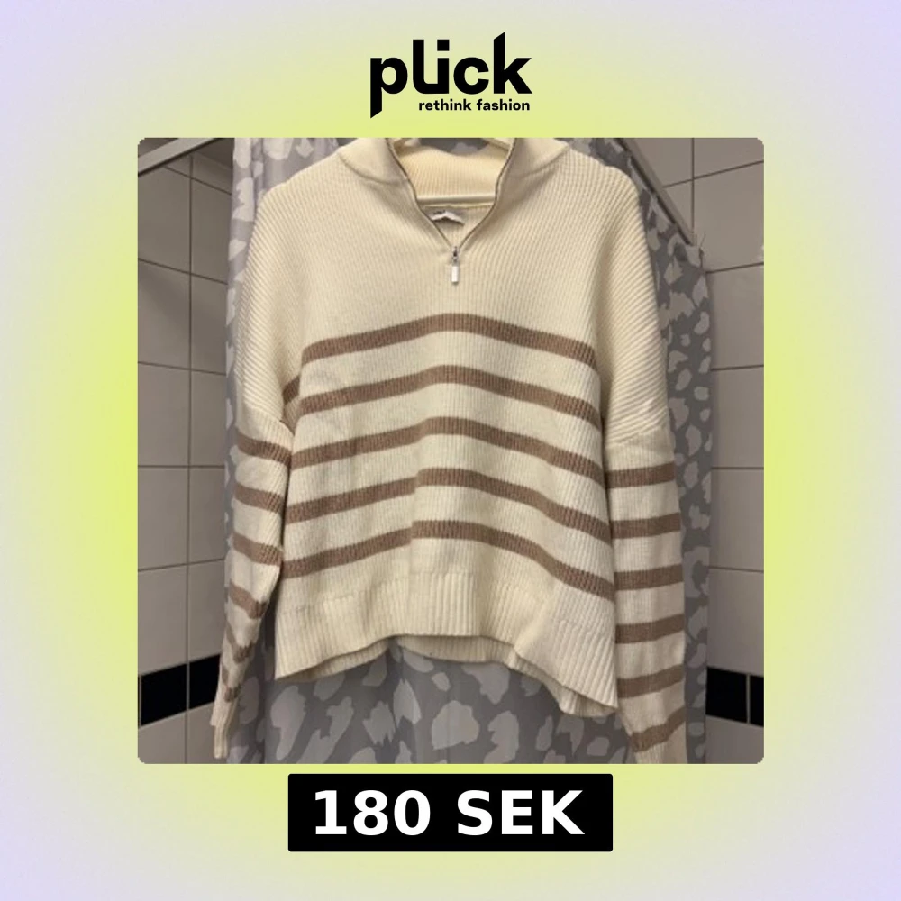 Säljer en mysig stickad tröja från MNG i krämvitt med bruna ränder. Tröjan har en dragkedja vid halsen och långa ärmar. Perfekt för kyliga dagar!