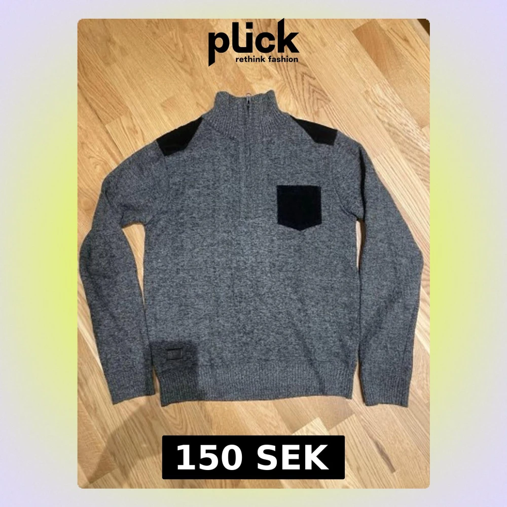 Snygg grå stickad tröja från Buffalo David Bitton med svart axelpatch och svart bröstficka. Half zip i halsen och ribbade muddar. Insidan har ett rutigt foder som ger extra värme. Perfekt för kyliga dagar och stilren look.