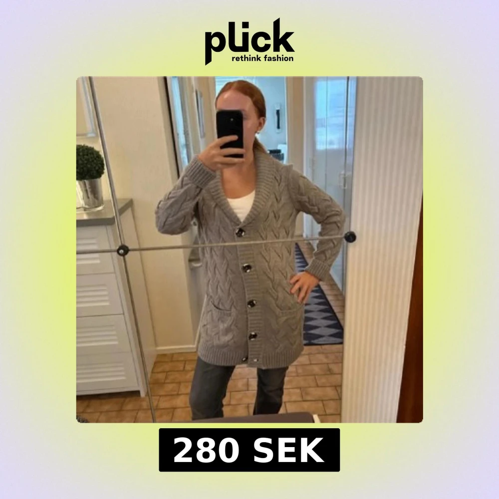 Säljer en mysig grå lång kofta med grovstickat kabelmönster, stora svarta knappar och två fickor framtill. Koftan har bred krage och ribbade muddar vid ärmslut och nederkant. Perfekt att slänga över en t-shirt för extra chill vibe. Aldrig använd så i nyskick!