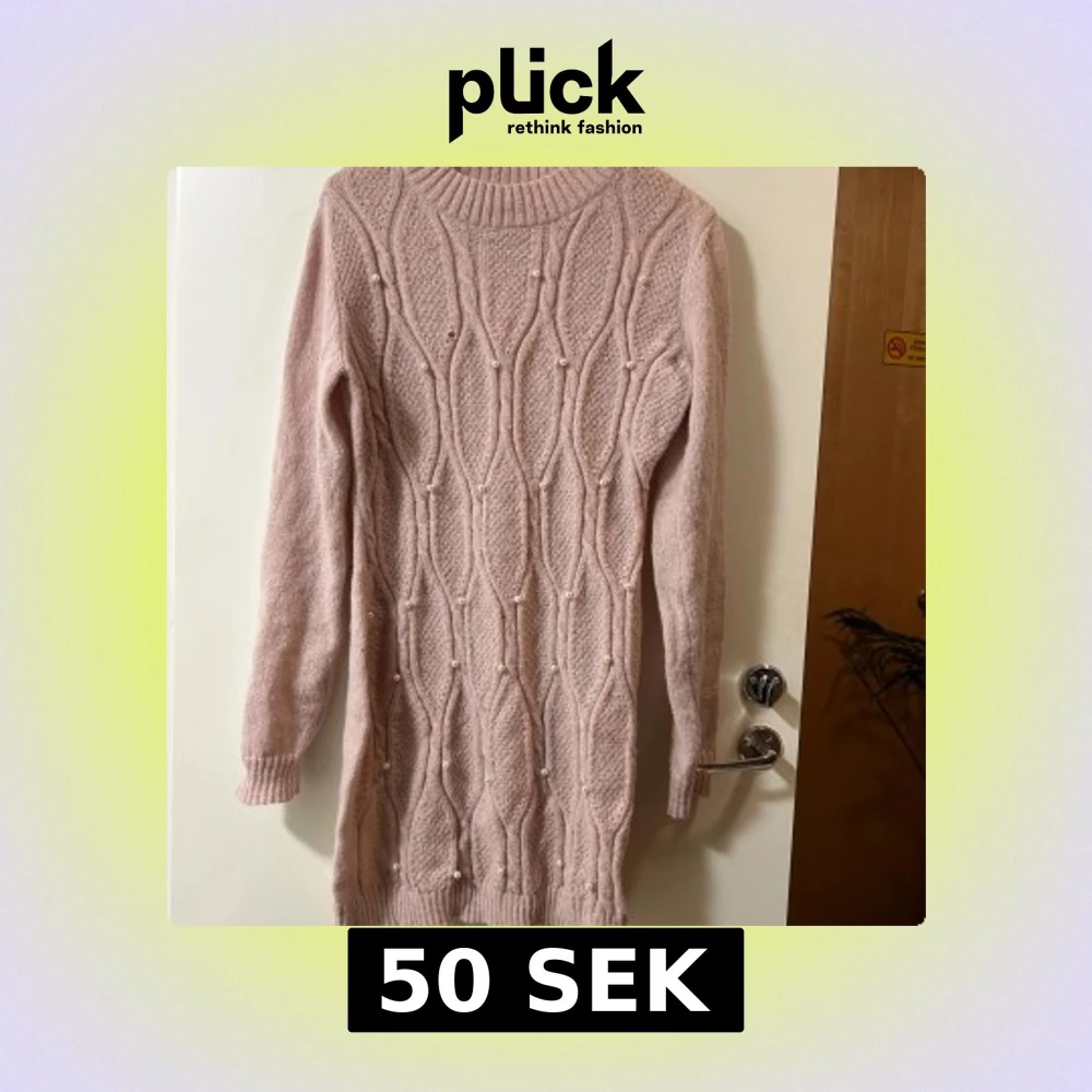 Supermysig stickad klänning i ljusrosa med lång ärm och ribbad hals samt nederkant. Klänningen har ett snyggt kabelstickat mönster och är dekorerad med små pärlor över hela framsidan. Perfekt för dig som gillar mjuka material och söta detaljer. Den har ett litet hål man kan sy ihop, pris kan absolut diskuteras