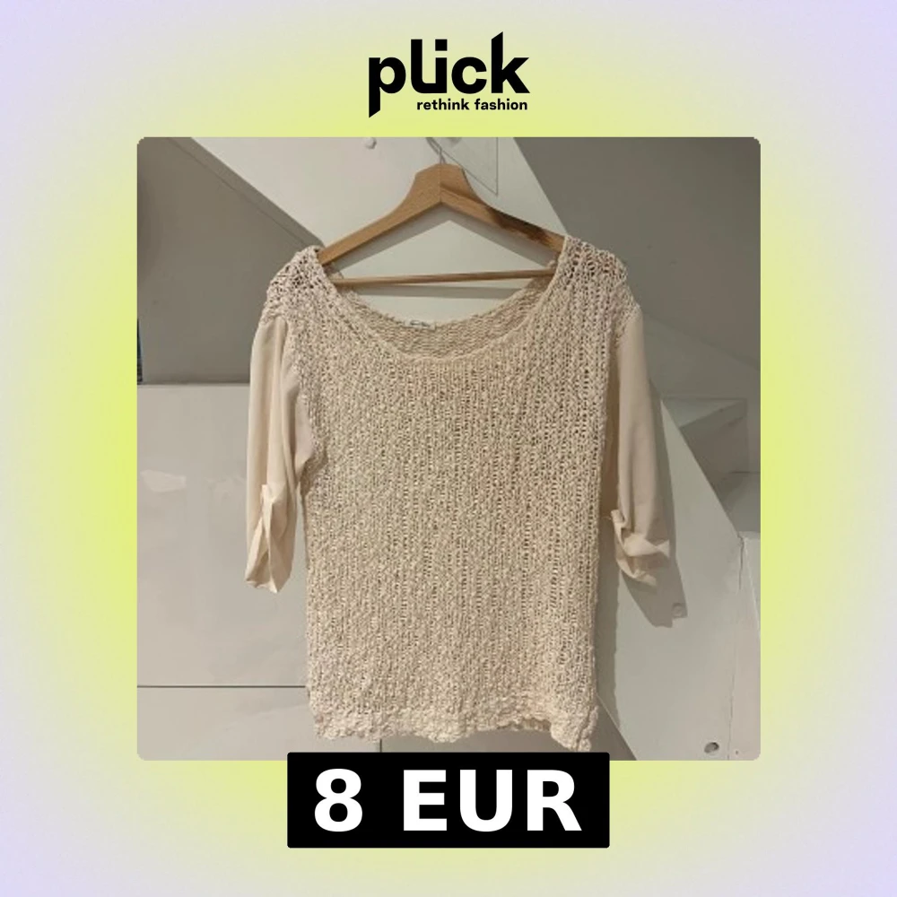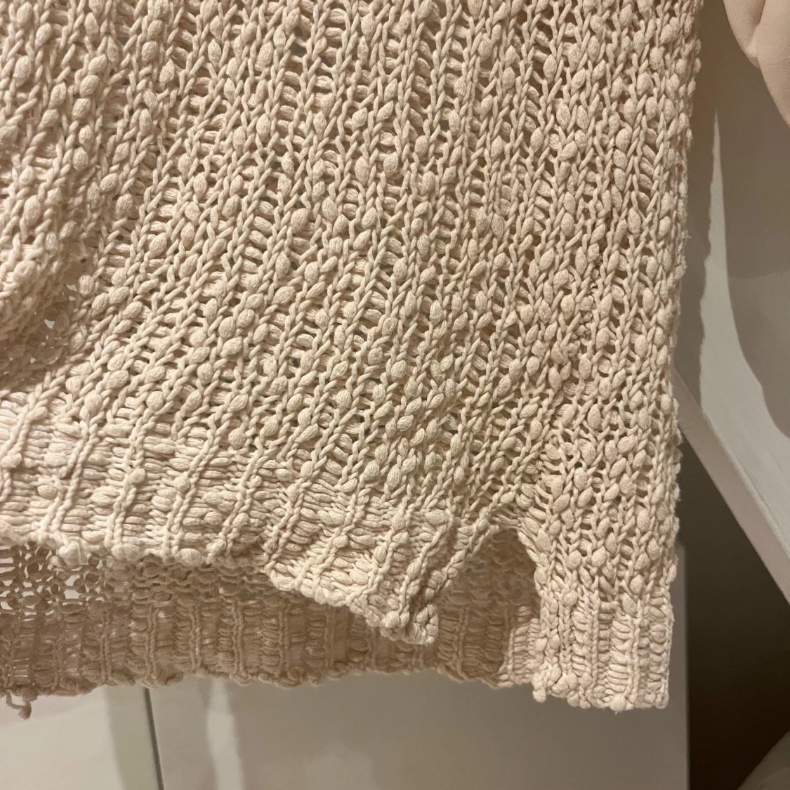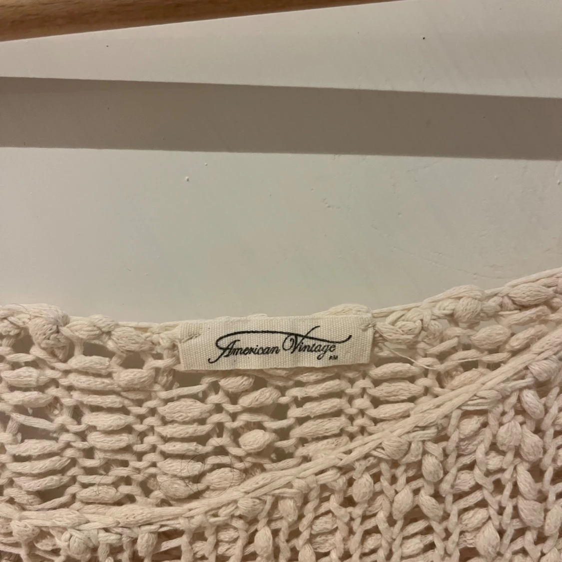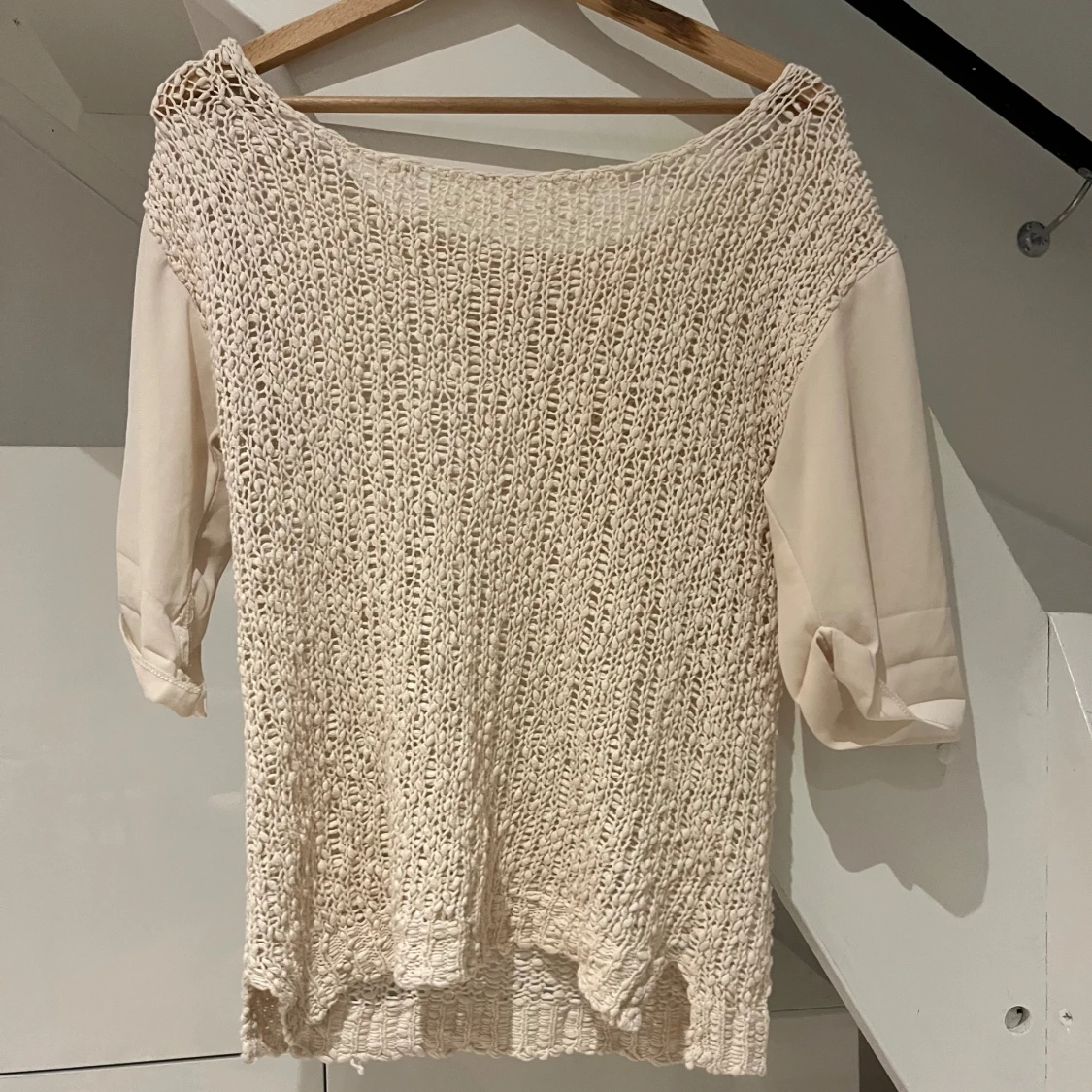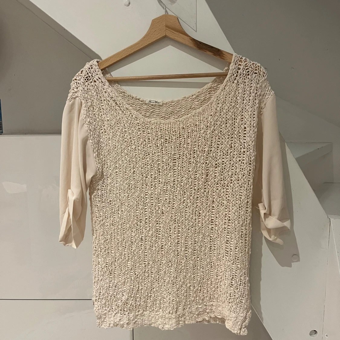 Säljer en beige stickad tröja från American Vintage med snyggt grovstickat framstycke och mjuka, enfärgade ärmar i trekvartsmodell. Tröjan har avslappnad passform och rund halsringning, perfekt för lager-på-lager-stil.