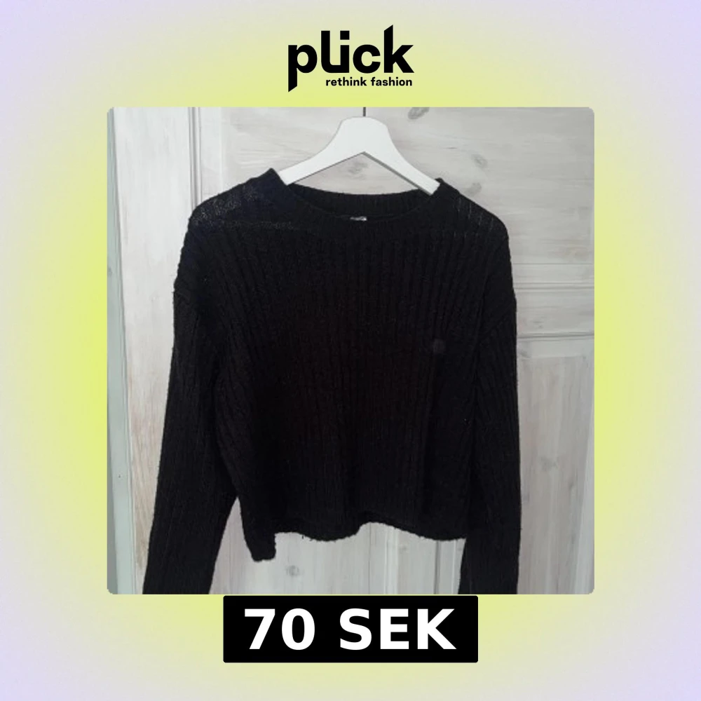Svart ribbstickad tröja från h&m storlek M. Tröjan har en klassisk rund halsringning, lång ärm och en något croppad passform. Perfekt för lager-på-lager och enkel att matcha med jeans eller kjol.