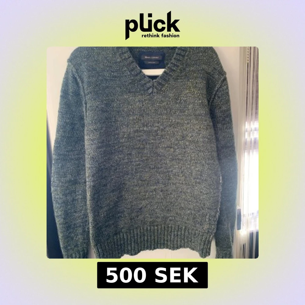 Säljer en grön stickad tröja från Marc O'Polo i alpackaull. Tröjan har en v-ringad hals och ribbade muddar vid ärmslut och nederkant. Perfekt för kyliga dagar!