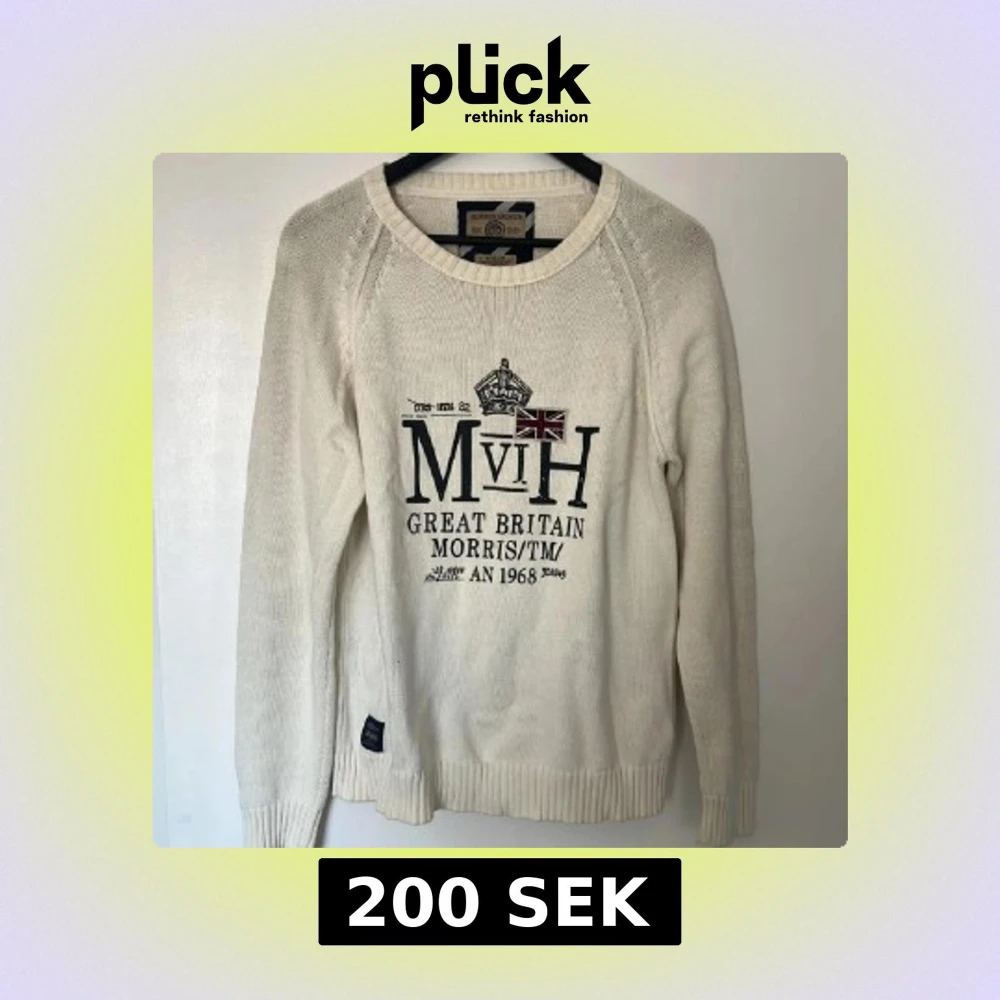 Snygg vit stickad tröja från Morris Gent's med tryck och broderad Union Jack-flagga framtill. Tröjan har rund halsringning, långa ärmar och ribbade muddar. Perfekt för dig som gillar klassisk brittisk stil och vill ha något som sticker ut.