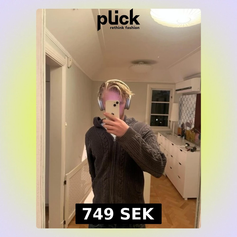 Mysig grå stickad hoodie med dragkedja framtill och huva. Snyggt flätmönster över hela tröjan och två fickor fram. Storleken säger XL men jag tycker den passar M. Modellen är 185cm