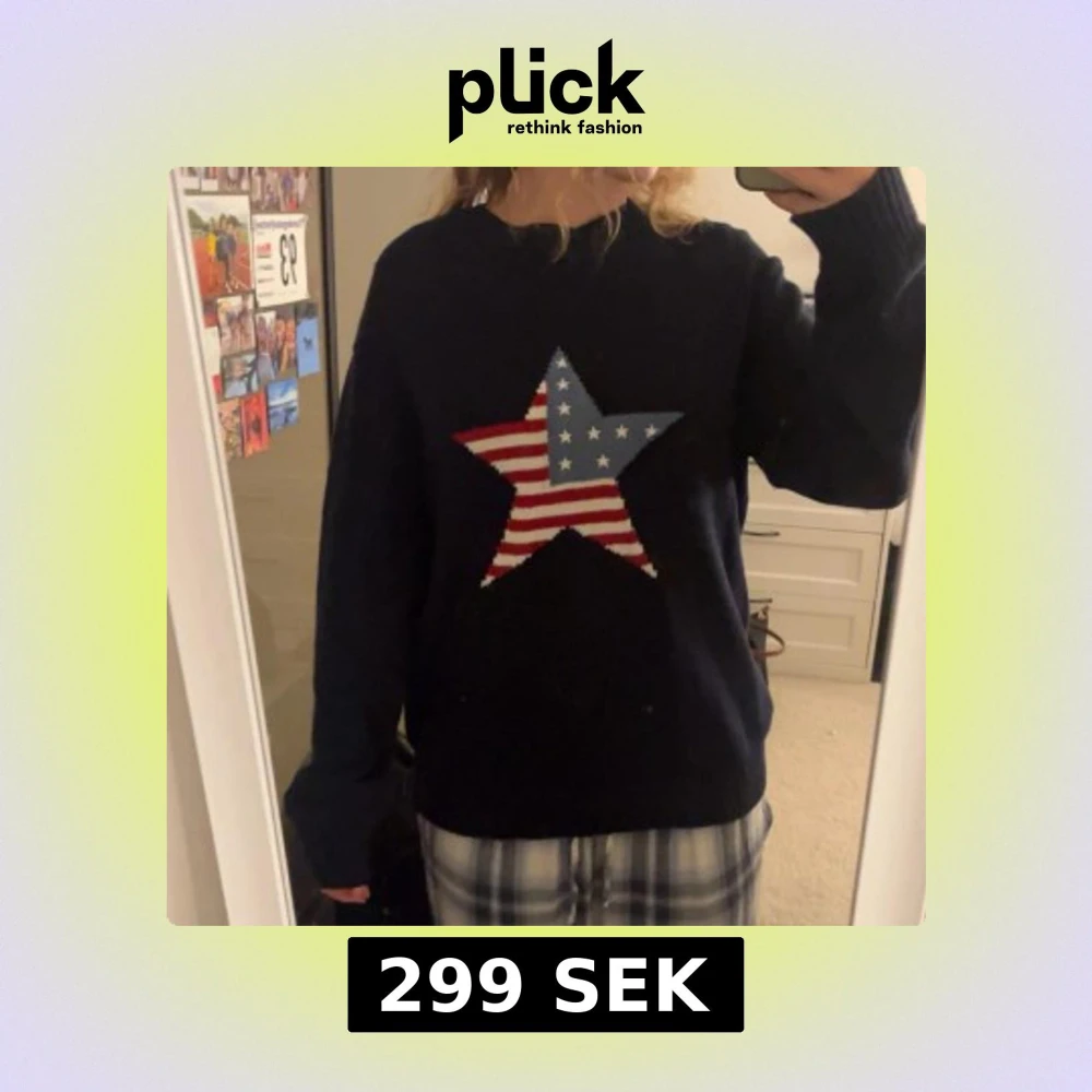 Säljer en mörkblå stickad tröja med en stor stjärna på bröstet i amerikanskt flaggmönster med rödvita ränder och vita stjärnor på blå bakgrund. Tröjan har långärmad passform och är perfekt för dig som gillar coola detaljer.