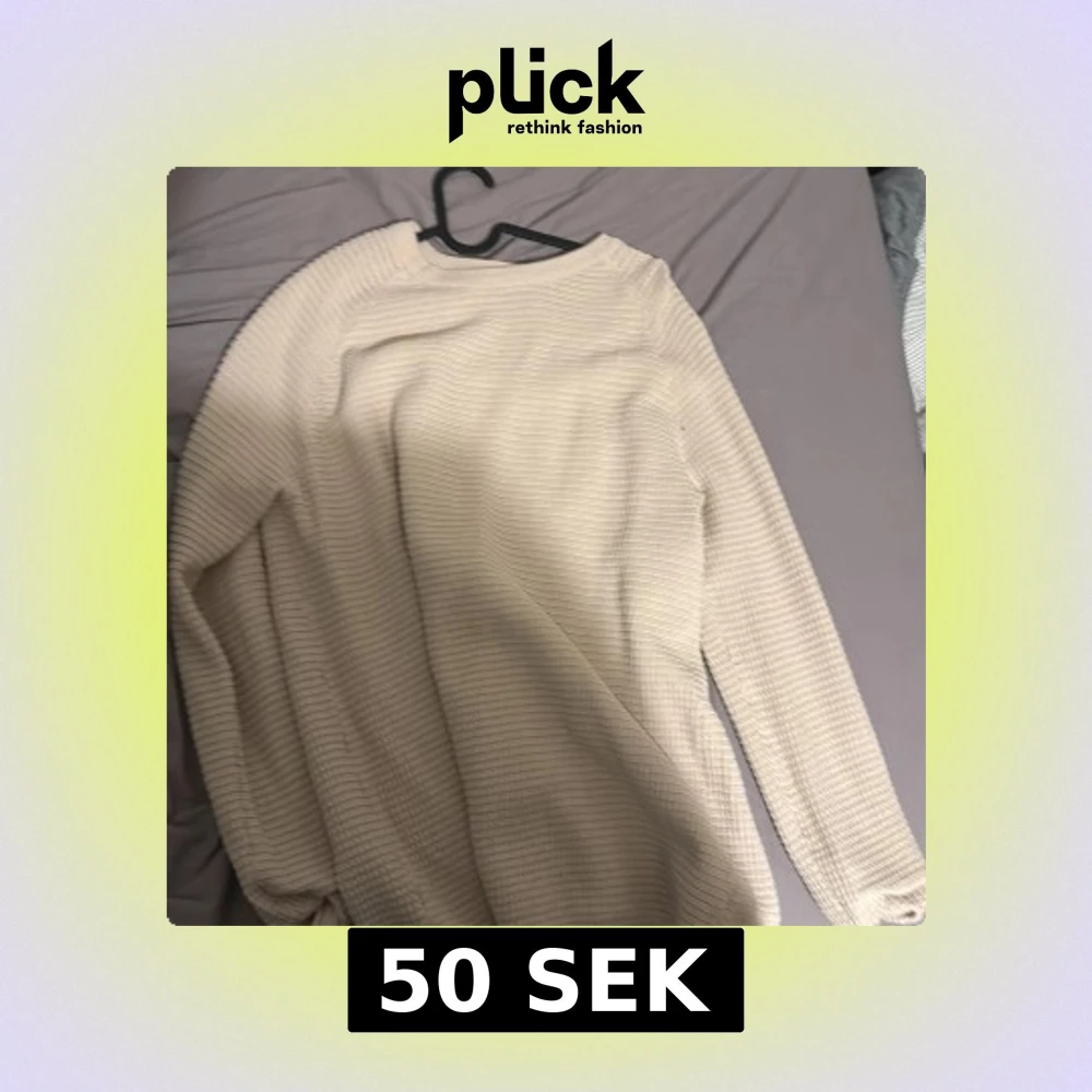 Säljer en beige stickad tröja med ribbad struktur och lång ärm. Perfekt för lager-på-lager och enkel att matcha med olika outfits. Tröjan har en klassisk rund halsringning och en avslappnad passform.