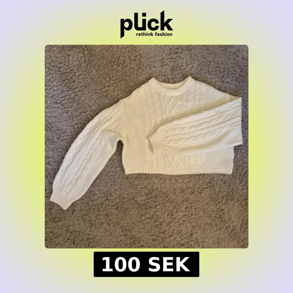 Säljer en vit stickad tröja från Divided med grovt flätmönster framtill och på ärmarna. Tröjan har en croppad passform, rund halsringning och långa ärmar med ribbade muddar. Perfekt för lager-på-lager under hösten och vintern.