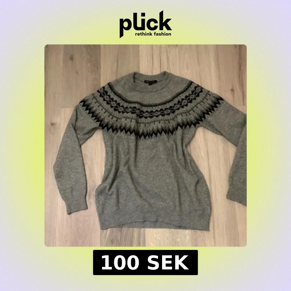 Säljer en mysig grå stickad tröja från MyWearWoman med ett snyggt mönster i svart och mörkgrått runt halsen. Tröjan har långa ärmar och en ribbad krage. Perfekt för kyliga dagar!