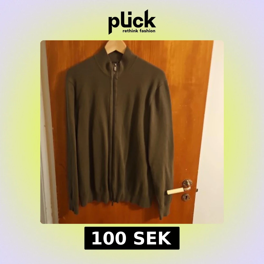 Olivgrön kofta från Hampton Republic i storlek M. Tröjan är stickad i bomull, har hel dragkedja framtill och hög krage. Perfekt för lager-på-lager och enkel att matcha med jeans eller chinos. Långärmad och stilren design.