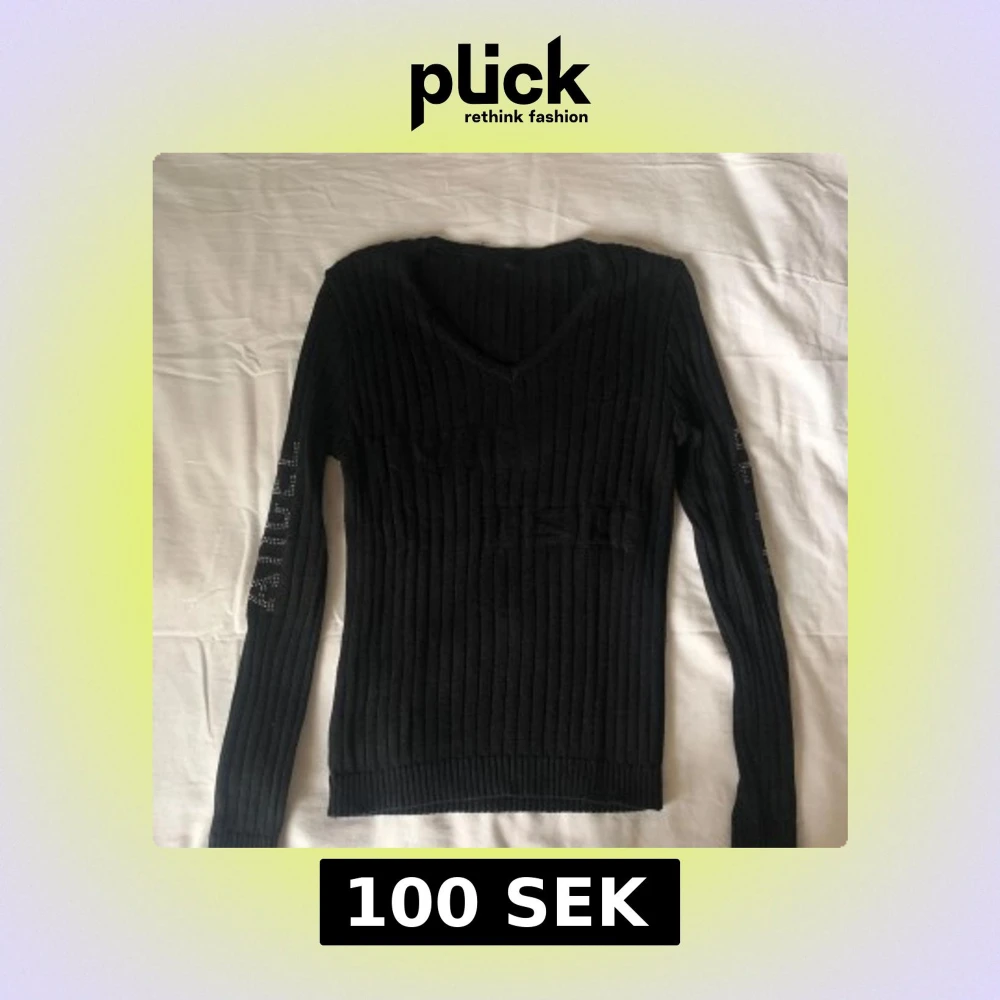 Svart ribbad stickad tröja med v-ringning och långa ärmar. Ena ärmen har texten 'ANGEL' i silvriga nitar och den andra 'DEVIL'. Tröjan har en tight passform men är väldigt stretchig. Märket heter prodotto italiano.