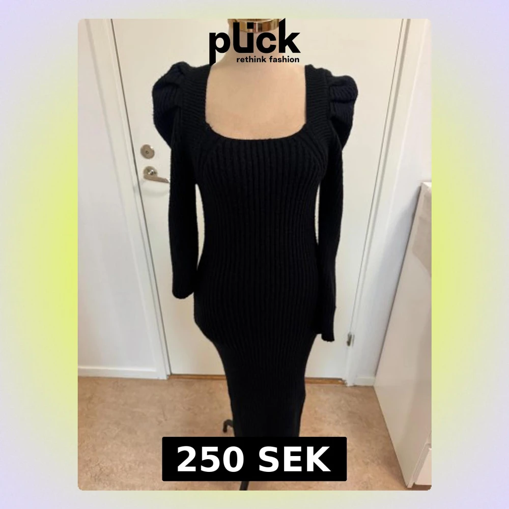 Svart ribbstickad långklänning från Shein med markerade axlar och lång ärm. Klänningen har fyrkantig ringning och figurnära passform som framhäver siluetten. Perfekt för dig som gillar en stilren och trendig look.