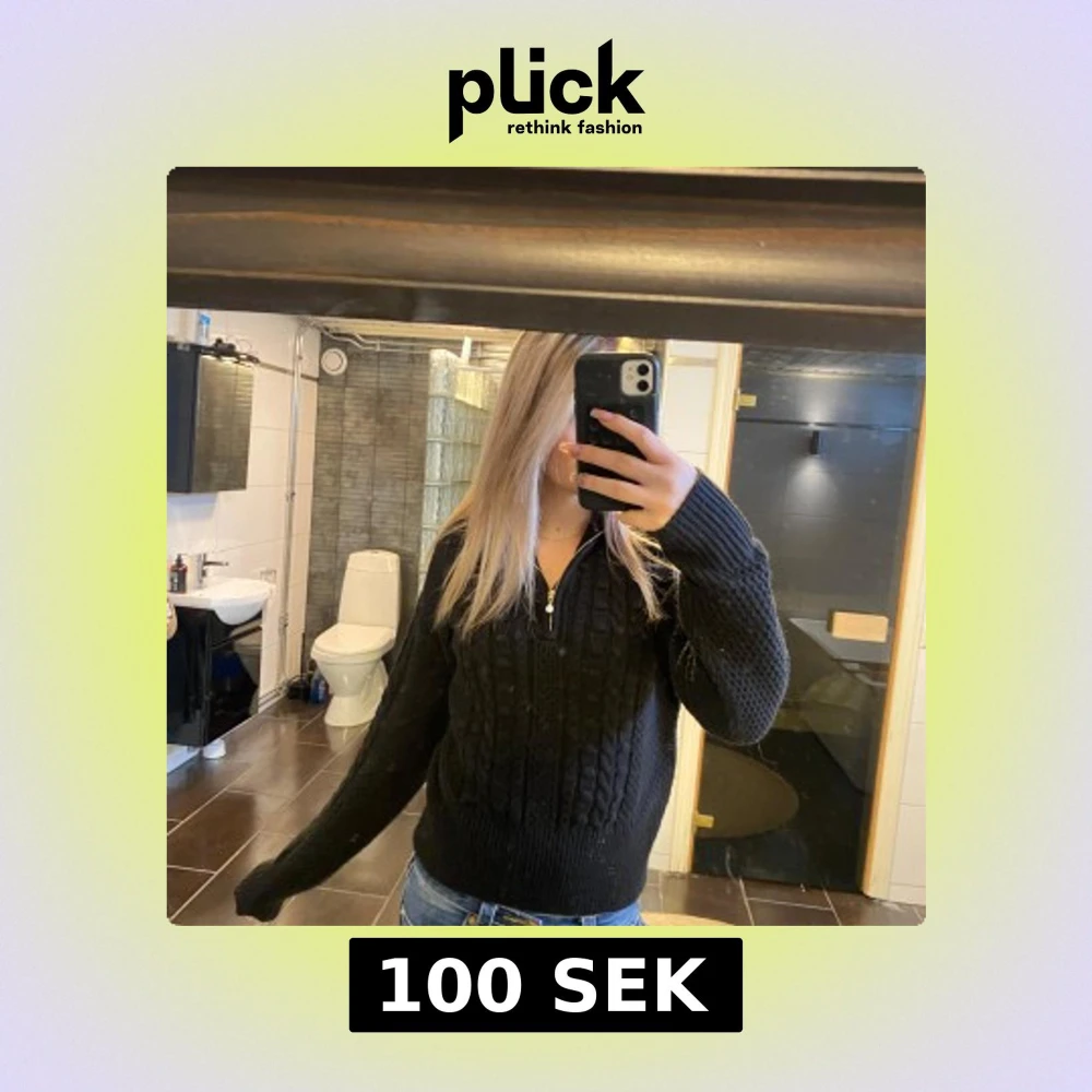 Säljer en svart stickad tröja med dragkedja framtill och kabelstickat mönster. Tröjan har lång ärm och en lite oversized passform, perfekt för lager-på-lager. Snygg och enkel att matcha till olika outfits.💗