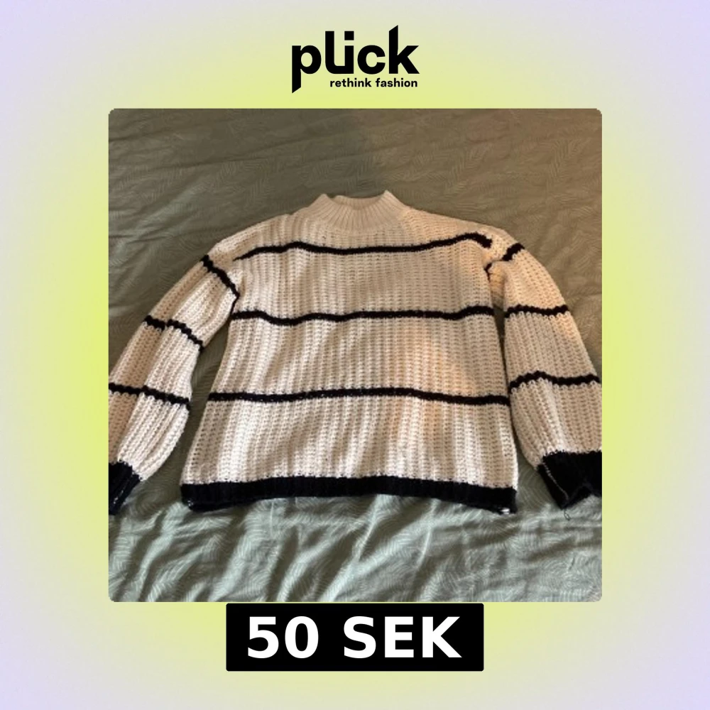 Säljer en chunky stickad tröja i vitt med svarta ränder. Tröjan har hög krage och långa ärmar med breda muddar. Perfekt för kyliga dagar när du vill vara både bekväm och snygg. Passar dig som gillar en avslappnad och trendig stil.