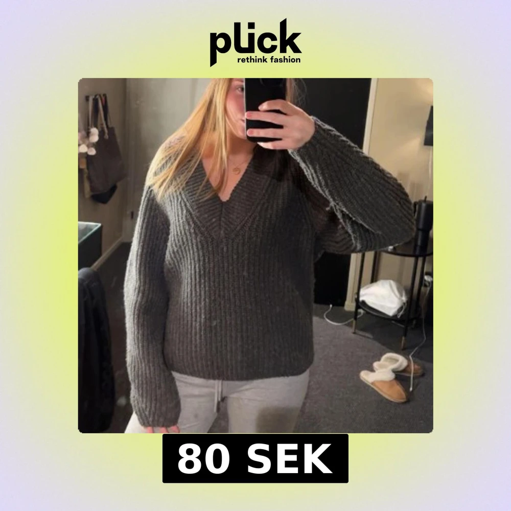 Mysig grå stickad tröja med v-ringning. Perfekt för kyliga dagar och ger en avslappnad look. Tröjan har långa ärmar och en bekväm passform.