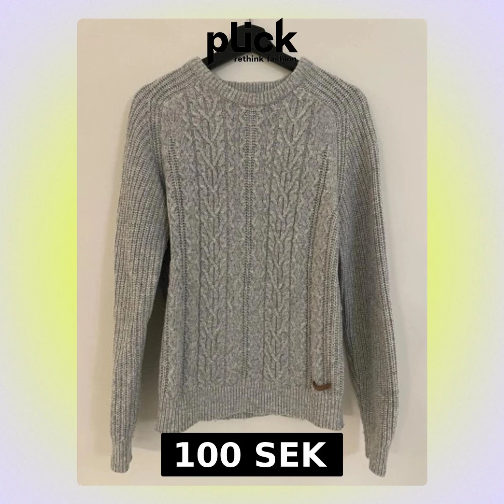 Säljer en ljusgrå stickad tröja från PIER ONE med klassiskt flätmönster framtill. Tröjan har rund halsringning, ribbade muddar och är långärmad. Materialet är en blandning av akryl, bomull, ull och polyamid vilket gör den både mjuk och varm.