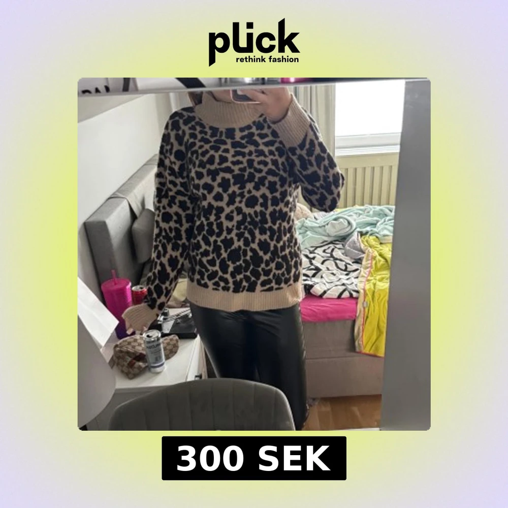 Säljer en snygg stickad polotröja med leopardmönster i beige och svart. Tröjan har långa ärmar och ribbade muddar vid ärmslut, nederkant och hals. Perfekt för dig som vill sticka ut lite extra!