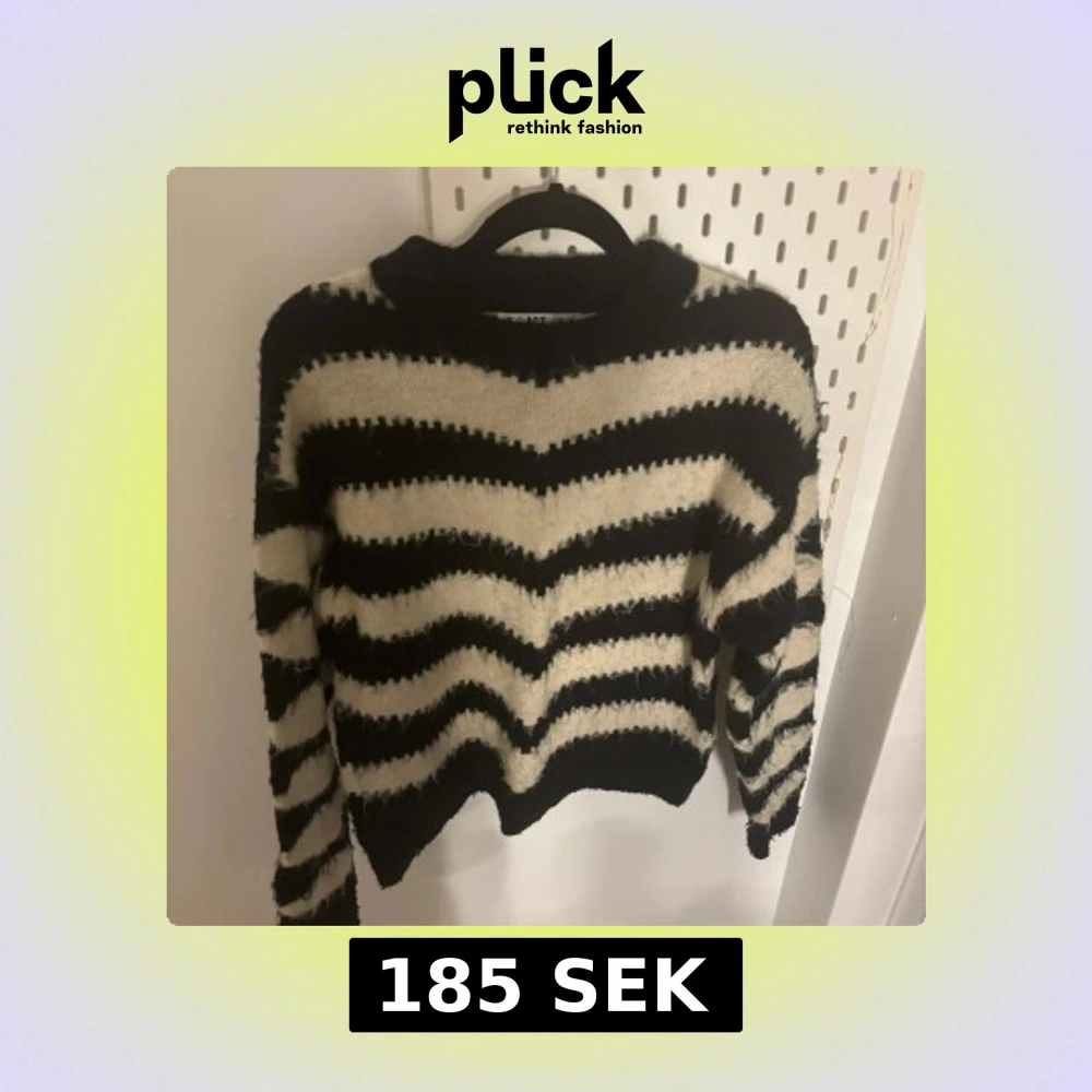 Säljer en mysig stickad tröja i svart och vitt med ett randigt mönster. Tröjan har långa ärmar och en rund halsringning. Perfekt för kyliga dagar!