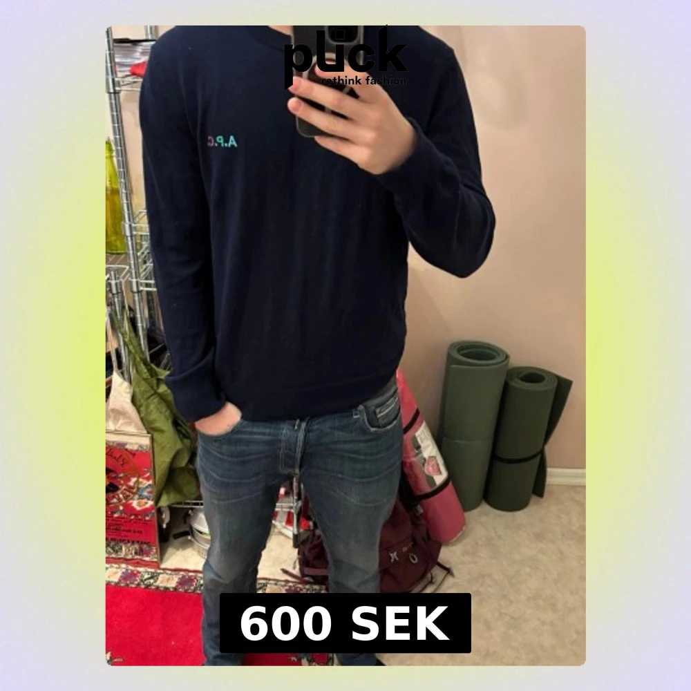 Säljer en stilren mörkblå tröja från A.P.C. med diskret logga broderad på bröstet i flera färger. Tröjan har rund halsringning och långa ärmar, perfekt för lager-på-lager under kyligare dagar.