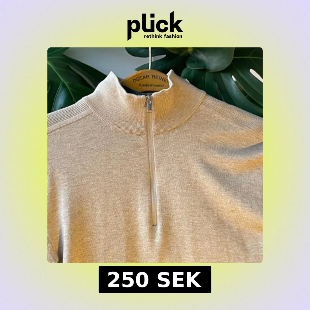 Snygg beige stickad tröja från Oscar Reiner med hög krage och half zip-dragkedja. Tröjan har lång ärm och en clean, stilren look som passar perfekt till lager-på-lager. Ribbad detalj vid krage och axlar för extra stilpoäng.