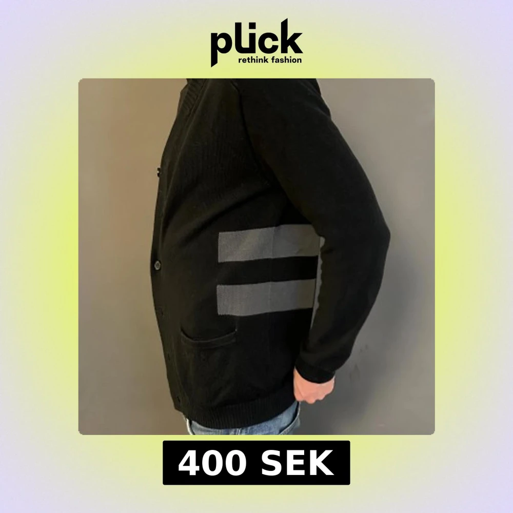 Svart kofta med gråa horisontella ränder på sidorna. Tröjan har ribbad krage och muddar, knappar framtill och två fickor. Materialet är stickat och koftan har en normal passform med långärmade ärmar. Perfekt för dig som gillar stilrena detaljer.