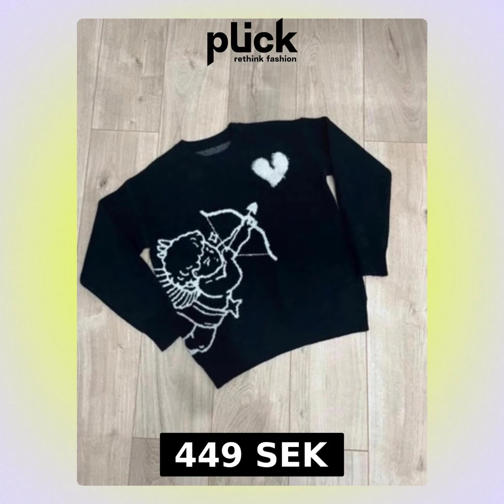 Svart stickad tröja från BHMG med vit illustration av en ängel som skjuter pil mot ett hjärta på framsidan. Baksidan har texten 'I WOULD RATHER NOT LOVE' och fler vita detaljer. Rund hals och långa ärmar, perfekt för dig som gillar statement-plagg.