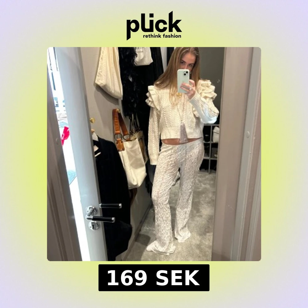 Säljer en vit stickad tröja med volangdetaljer på axlarna. Tröjan är croppad och har långa ärmar, perfekt för en trendig look. Den är både mysig och stilren, idealisk för kyligare dagar.