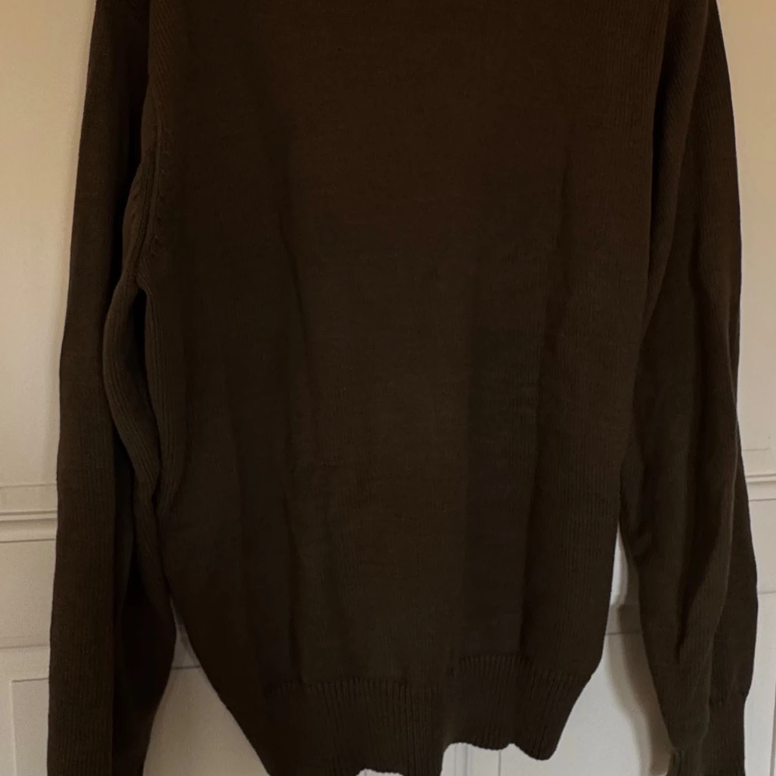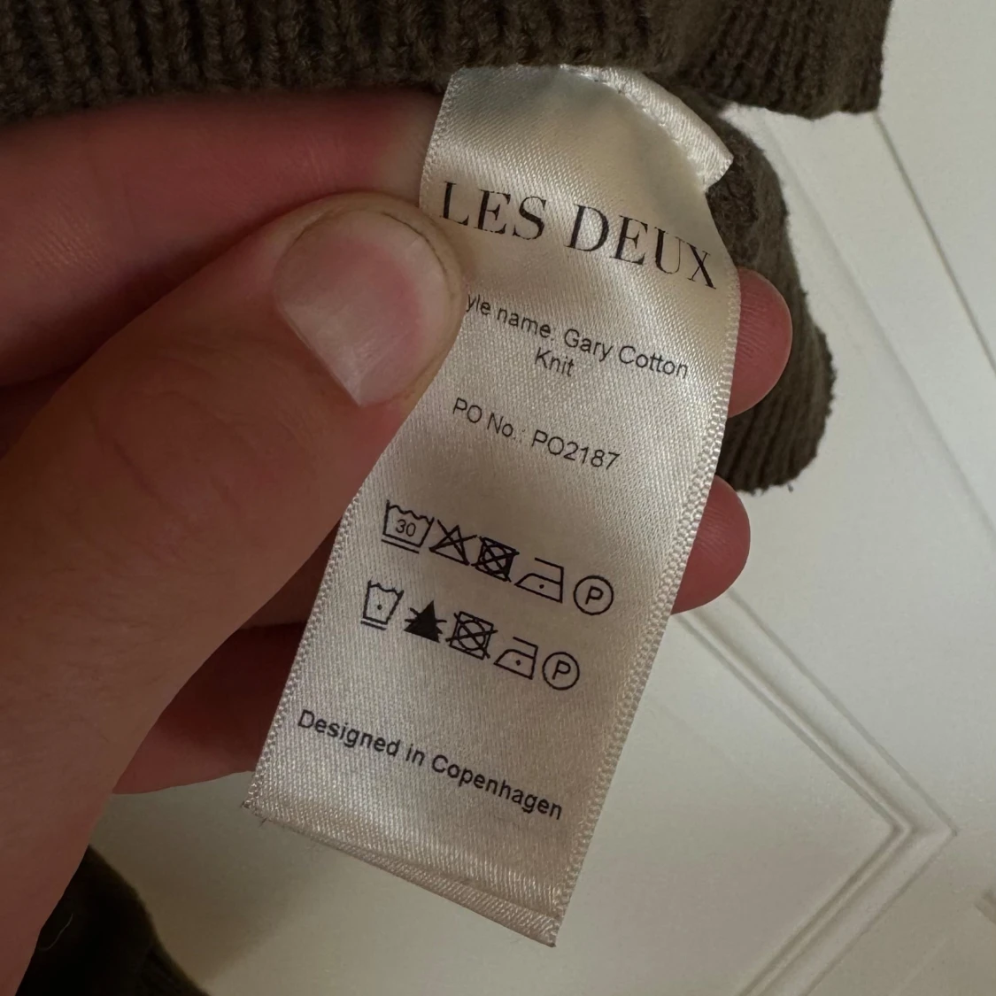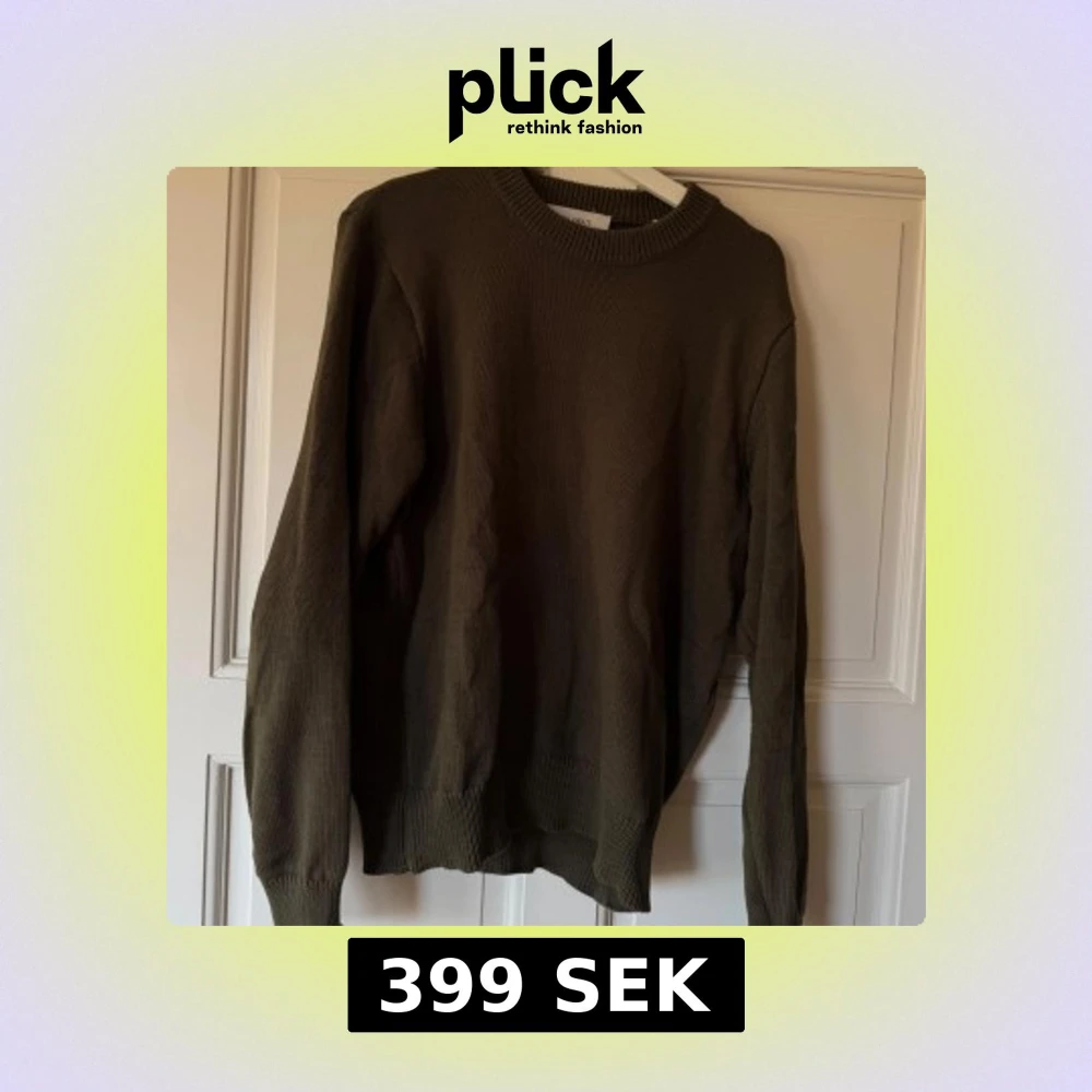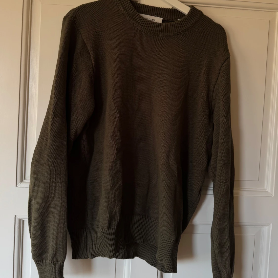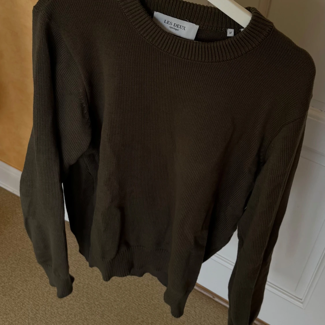 Säljer en olivgrön stickad tröja från Les Deux i storlek M. Svårt att få en ärlig bild på tröjans färg, men syns som tydligast på bild 2. Säljer den för den har blevit för liten för mig. Tröjan har mer en loose fit i modellen.