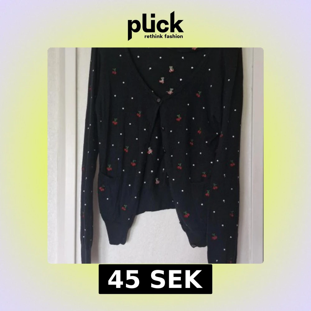 Svart kofta från R&D med broderade körsbär och små vita prickar över hela plagget. V-ringad med knappar framtill, två fickor och långa ärmar. Tunn och stickad, perfekt för lager-på-lager. Vid höger ficka kan man se att en maska är skadad men några andra skavanker har jag inte sett och det är inget som stör helhetsintrycket.