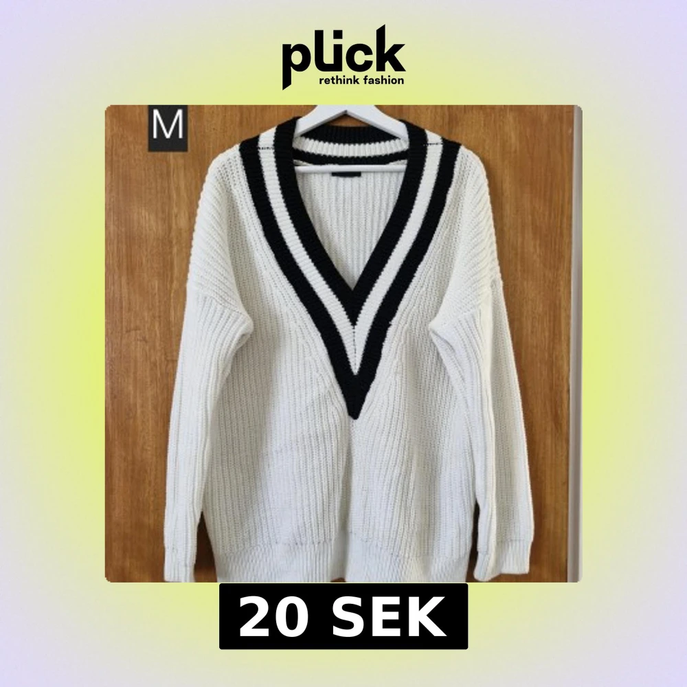 Säljer en vit stickad tröja med bred v-ringning som har svarta och vita ränder. Tröjan är ribbstickad och har långa ärmar. Perfekt för dig som gillar en klassisk men ändå trendig look.