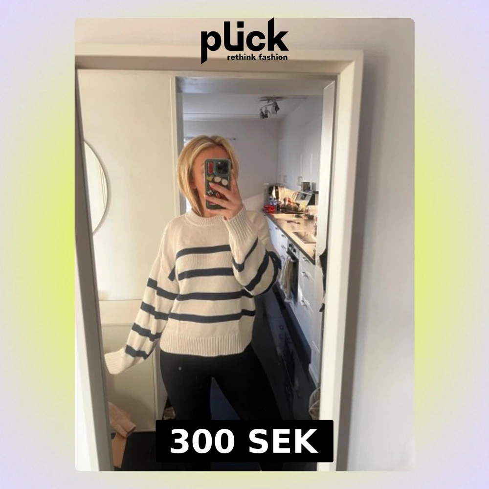 Säljer en mysig stickad tröja i vit med breda marinblå ränder. Tröjan har rund hals, långa ärmar och ribbade muddar vid ärmslut och nederkant. Perfekt för dig som gillar en chill och stilren look med lite oversized känsla.