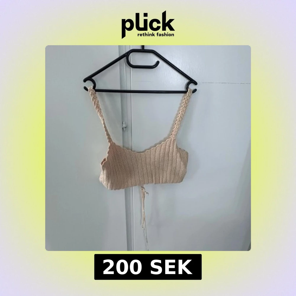 Säljer en beige stickad croppad linnetopp med breda axelband och knytning framtill. Perfekt för varma dagar och enkel att styla med olika outfits.