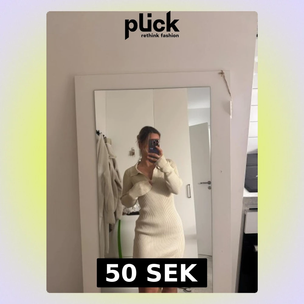 Säljer en beige ribbad stickad klänning med krage och v-ringning. Klänningen är kort och har lång ärm, sitter figurnära och är supermjuk. Perfekt för dig som gillar en enkel men snygg look. Jag är xs men passar mig så passar även en xs, S