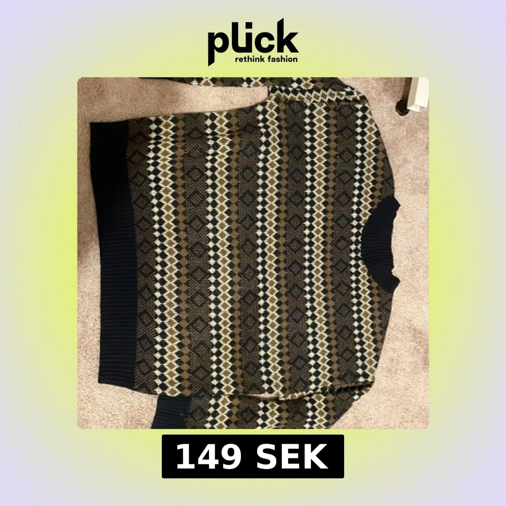 Säljer en stickad tröja med snyggt geometriskt mönster i brunt, beige, svart och mörkblått. Tröjan har ribbade muddar vid ärmslut, hals och nederkant. Perfekt för dig som gillar retrovibbar och vill ha något unikt i garderoben.