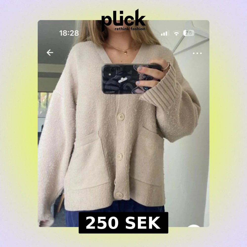 Säljer en beige, oversized kofta med v-ringning och stora ribbade muddar. Koftan har tre knappar framtill och två praktiska fickor. Materialet är stickat och ger en chill och mysig vibe, perfekt för lager-på-lager under kallare dagar.