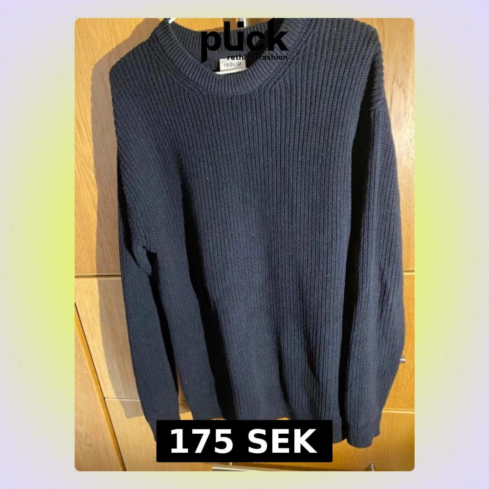 Säljer en mörkblå stickad tröja från Solid med grov ribbad struktur och rund hals. Tröjan har långärmade ärmar och en klassisk, enkel design som funkar till många stilar. Perfekt för kyliga dagar och enkel att matcha med jeans eller chinos.