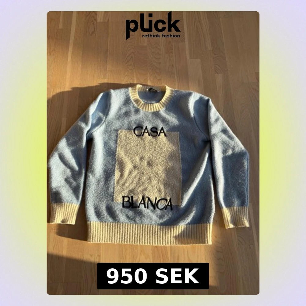 Snygg ljusblå stickad tröja från Casa Blanca med kontrasterande krage, muddar och en stor beige ruta framtill. Svart broderad text 'CASA BLANCA' på framsidan. Perfekt för dig som gillar unik design och mjuka material.