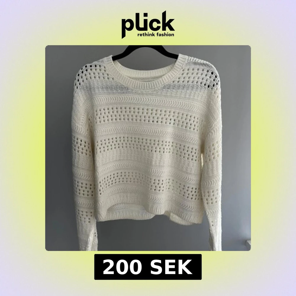 Säljer en snygg vit stickad tröja från Pigalle. Tröjan har ett unikt hålmönster och långa ärmar. Perfekt för lager-på-lager-stil och ger en luftig känsla. Passar bra till både jeans och kjol.
